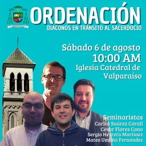El sábado 06 de agosto será la Ordenación Diaconal, en camino al Presbiterado, de los seminaristas del Pontificio Seminario Mayor San Rafael de lo Vásquez. La ceremonia será a las 10:00 horas en la Iglesia Catedral de Valparaíso y será presidida por Monseñor Jorge Patricio Vega Velasco, Obispo de Valparaíso.